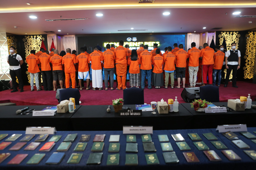 Jakarta: Sebanyak 30 tahanan warga negara asing (WNA) yang bermasalah dengan keimigrasian diperlihatkan dalam konperensi pers di Gedung Direktorat Jenderal Imigrasi, Jakarta, Rabu, 8 Oktober 2025.