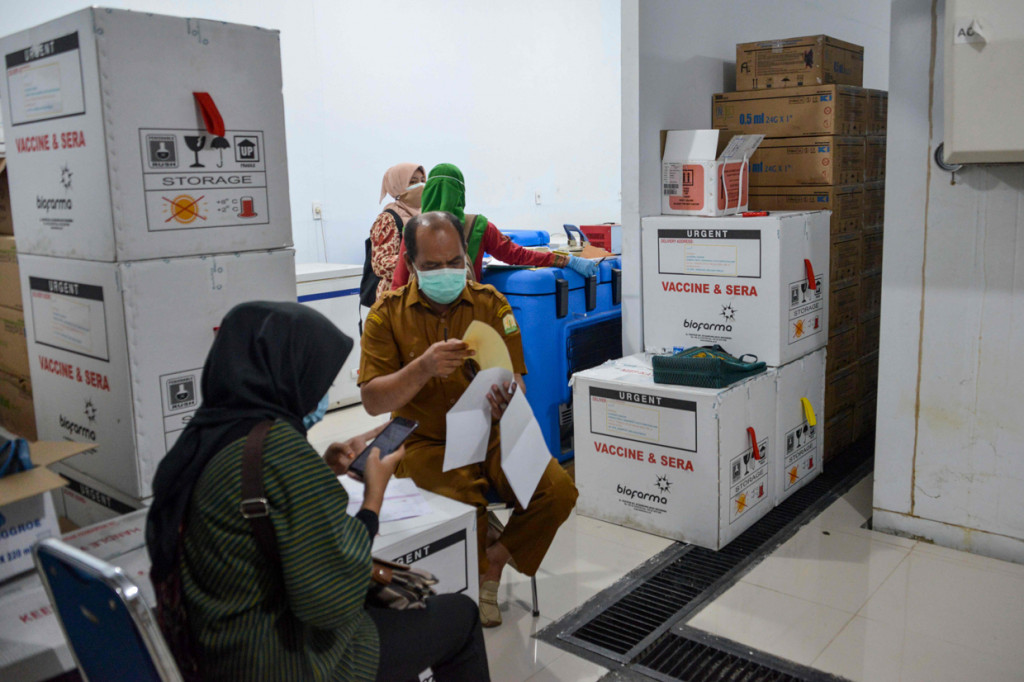 Pendistribusian awal telah dilakukan dalam dua hari terakhir ke 32 provinsi. Sejumlah 401.240 vial dikirim ke 14 provinsi. Kemudian, pada 4 Januari 2021 ke 18 provinsi sejumlah 313 ribu vial. AFP Photo/Chaideer Mahyuddin Cek Berita dan Artikel yang lain di Google News