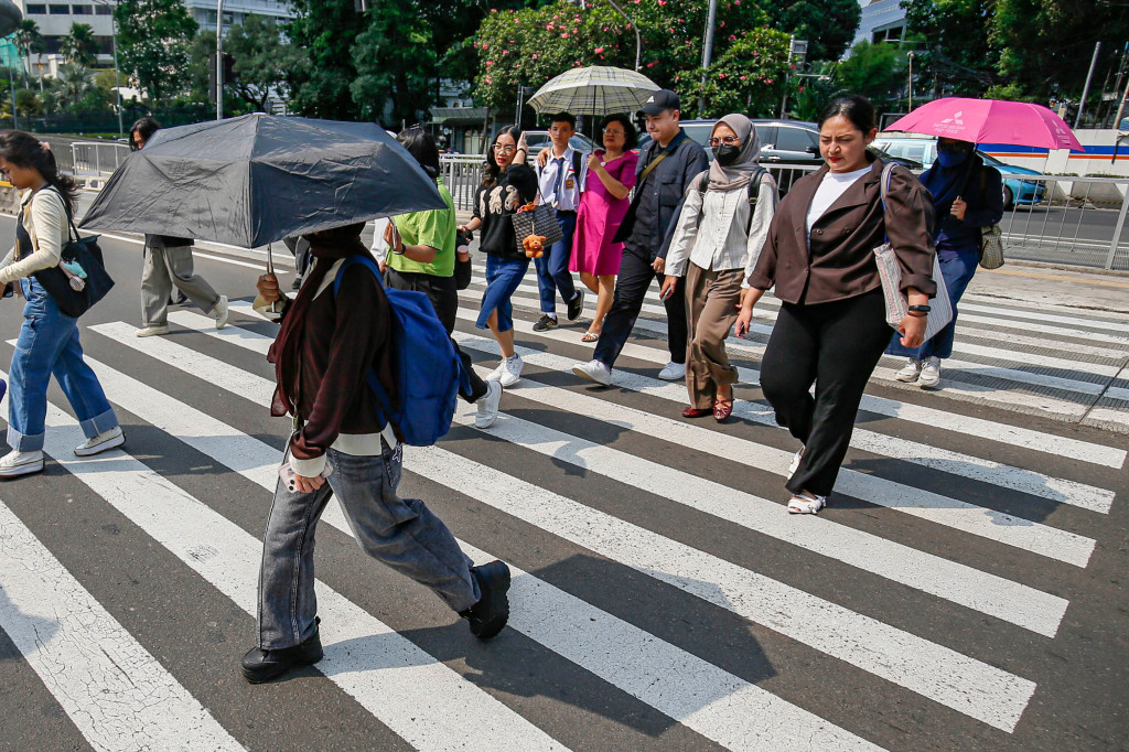 Jakarta: Pejalan kaki menggunakan payung untuk melindungi diri dari cuaca terik di kawasan Tosari, Jakarta, Senin, 27 April 2026.