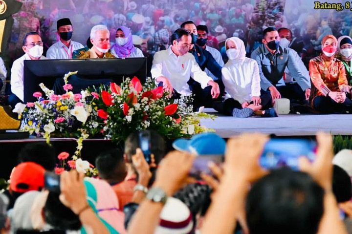 Batang: Presiden Joko Widodo menghadiri acara syukuran hasil bumi Gerakan Masyarakat (Gema) Perhutanan Sosial yang digelar di Lapangan Omah Tani, Kabupaten Batang, Provinsi Jawa Tengah, Rabu, 8 Juni 2022.