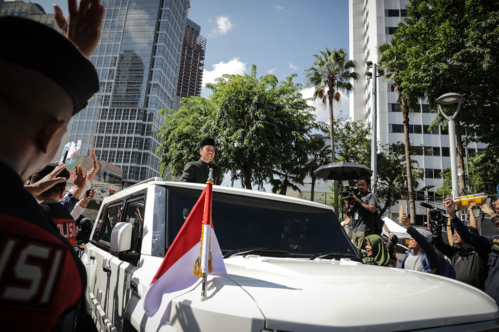 Jakarta: Ribuan warga riang gembira menyambut iring-iringan Presiden ke-7 RI Joko Widodo di Bundaran Hotel Indonesia, Jakarta, Minggu, 20 Oktober 2024.