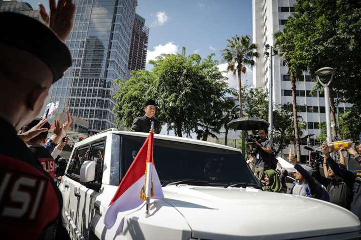 Joko Widodo terpantau melintas sekitar pukul 14.22 WIB. Dengan tersenyum, Jokowi melambaikan tangan dan memberikan hormat saat menyapa masyarakat di Bundaran HI.