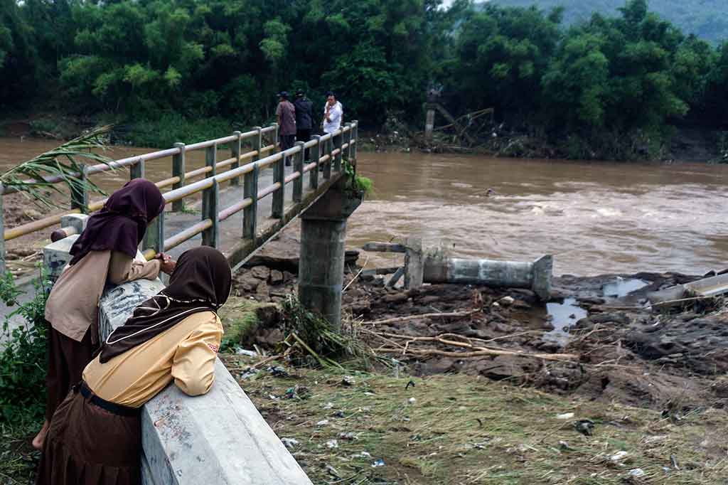 Warga mengambil gambar jembatan yang rusak di Imogiri, Bantul, Yogyakarta, Kamis, 30 November 2017.
