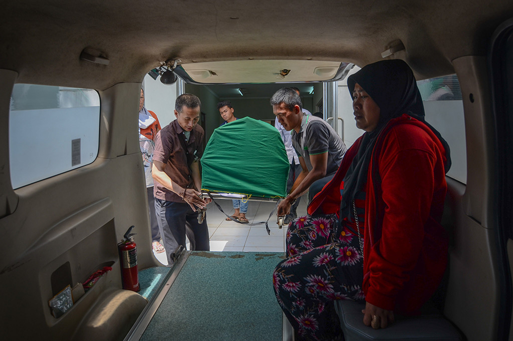 Keluarga memindahkan jenazah korban meninggal akibat keracunan minuman keras (miras) oplosan ke dalam mobil ambulans di Rumah Sakit Umum Daerah (RSUD) Cicalengka, Kabupaten Bandung, Jawa Barat.