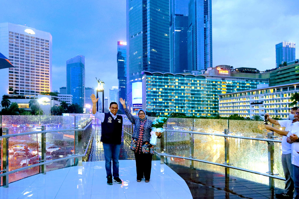Jakarta: Gubernur DKI Jakarta Anies Baswedan meresmikan halte bus TransJakarta Bundaran HI, Sabtu, 15 Oktober 2022. Anies menyatakan bahwa halte tersebut dibangun untuk menyajikan pemandangan indah sekitar kawasan dari ketinggian yang dapat dinikmati semua lapisan masyarakat.