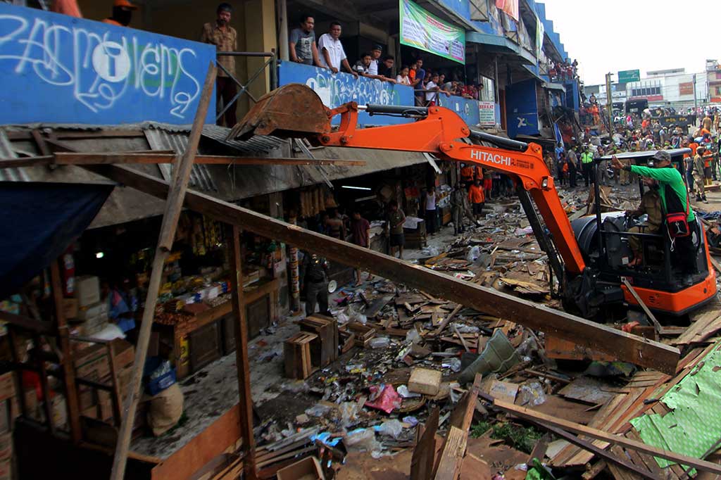 Metrotvnews.com, Ciputat: Petugas Satpol PP dengan menggunakan alat berat menghancurkan ratusan lapak saat penertiban pedagang kaki lima di Pasar Ciputat, Ciputat, Tangerang Selatan, Banten, Senin (30/5/2016). Meski sering dilakukan penertiban namun PKL tetap kembali berjualan karena pemerintah daerah tidak tegas dan serius mengatasi masalah tersebut. ANTARA/Muhammad Iqbal Cek Berita dan Artikel yang lain di Google News
