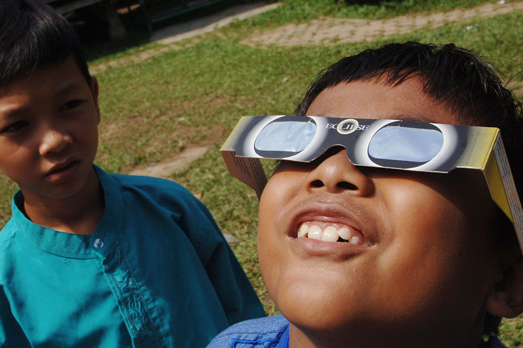 Metrotvnews.com, Padang: Sejumlah siswa Sekolah Alam Minangkabau mencoba alat pengamatan gerhana matahari yang dibuat dari barang bekas di sekolah mereka, Padang, Sumatera Barat, Jumat (4/3/2016). Data BMKG Sumbar, provinsi itu akan mengalami gerhana matahari dengan magnitudo 90-99% pada 9 Maret 2016 kecuali di Silaut, Kabupaten Pesisir Selatan dan Desa Sei, Kabupaten Kepulauan Mentawai, yang akan mengalami gerhana matahari total (GMT) dengan magnitudo mencapai 101,2%. ANTARA/Iggoy el Fitra Cek Berita dan Artikel yang lain di Google News