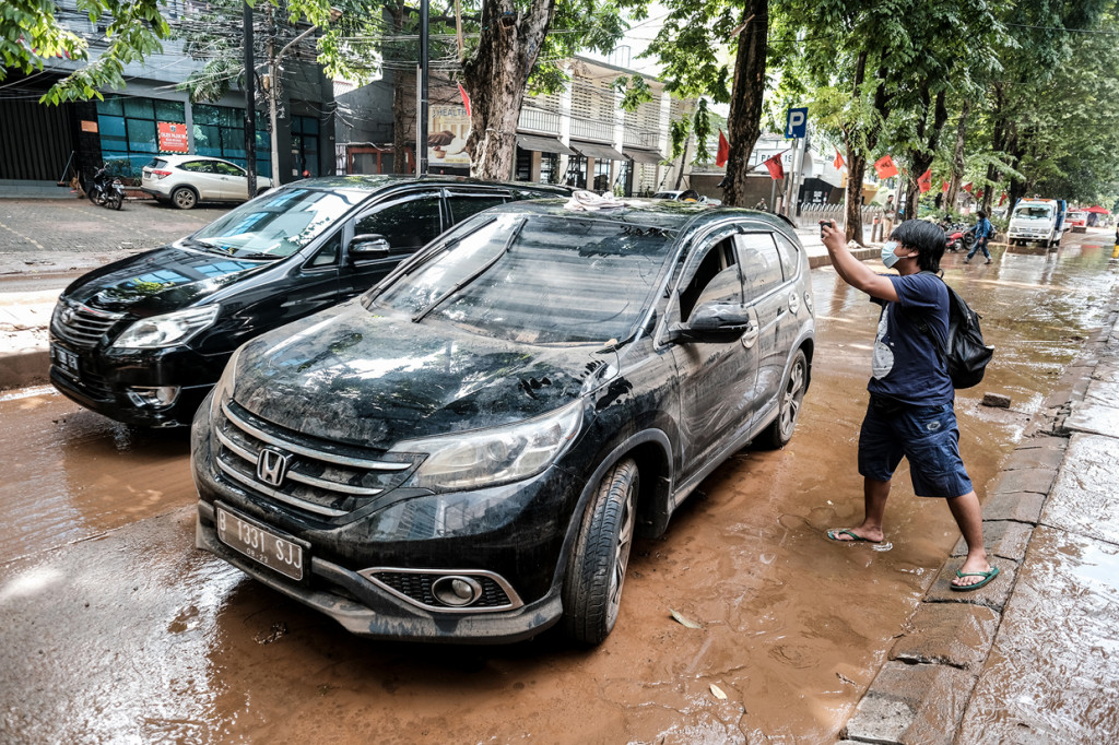 Meski banjir telah surut, kini lumpur memenuhi kawasan elite di Jakarta Selatan tersebut.