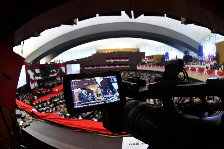 Jakarta: Presiden Joko Widodo berganti kostum dengan mengenakan pakaian adat Suku Sasak, Nusa Tenggara Barat berwarna cokelat keemasan saat menyampaikan pidato kedua sidang tahunan MPR, DPR, dan DPD di Gedung Parlemen, Senayan, Jakarta, Jumat, 16 Agustus 2019. Antara Foto/Sigid Kurniawan Cek Berita dan Artikel yang lain di Google News