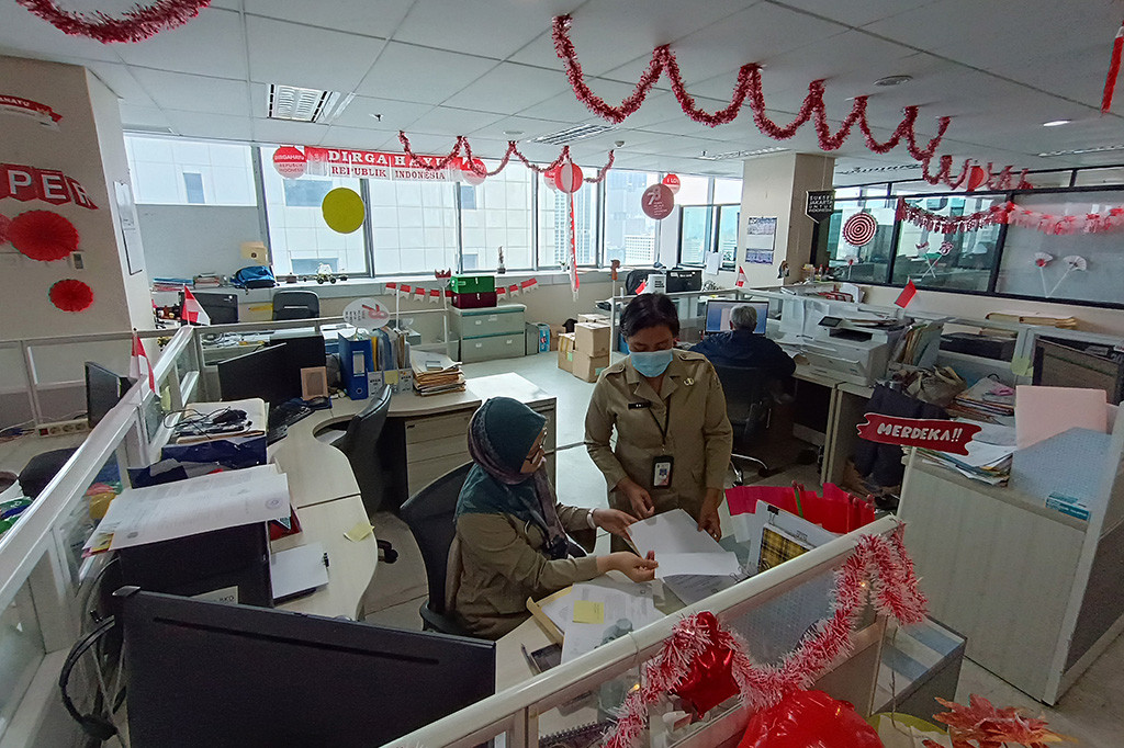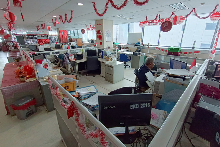 Sejumlah ruangan di Balai Kota, seperti di ruangan Badan Kepegawaian Daerah (BKD) DKI Jakarta terlihat sepi dari biasanya, sejumlah kursi tampak kosong, sementara di sisi lain ada sejumlah pegawai yang melakukan rapat secara virtual (zoom meeting).