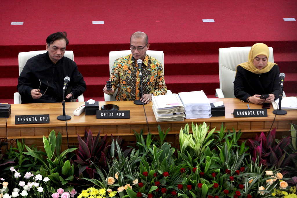 Jakarta: Komisi Pemilihan Umum mengesahkan perolehan suara pasangan calon presiden dan wakil presiden Prabowo Subianto-Gibran Rakabuming Raka unggul di Sulawesi Tenggara berdasarkan rapat pleno rekapitulasi hasil perolehan suara nasional di Kantor KPU RI, Jakarta, Rabu, 13 Maret 2024.