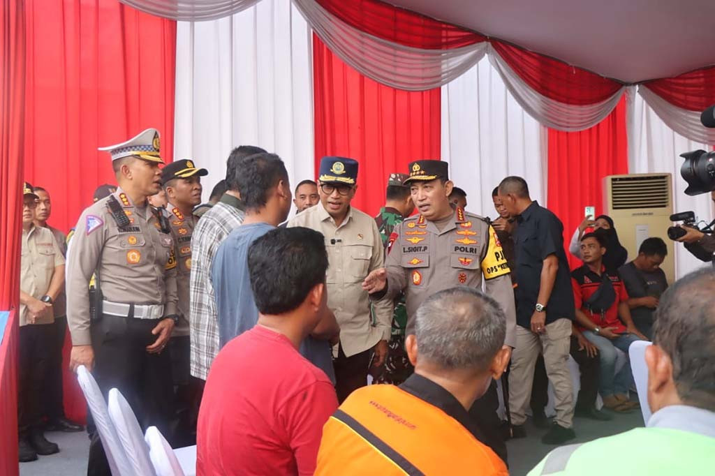 Sidoarjo: Kapolri Jenderal Listyo Sigit Prabowo bersama Panglima TNI Jenderal Agus Subiyanto dan Menteri Perhubungan Budi Karya Sumadi, meninjau pelayanan dan pengamanan arus mudik Lebaran 2024 di Terminal Purabaya, Kamis, 4 April 2024.
