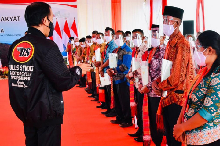 "Kalau kita sudah pegang sertifikat, coba sertifikatnya dipegang semua, yang di layar semua diangkat dulu, mau saya hitung sebentar, yang di layar juga mau saya hitung 1, 2, 3,4, 5, 6, 7, 8, 9, 10, 18, 19, 21, 22, 20.087 sudah betul. Semua sudah pegang," kata Jokowi, di Stadion Simangaronsang, Humbang Hasundutan, Sumut, Selasa, 27 Oktober 2020.