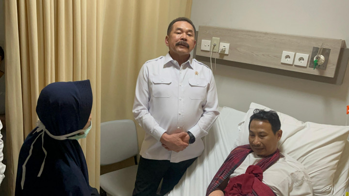 Tangerang: Jaksa Agung ST Burhanuddin menjenguk Jaksa Dymar Sasongko Kurniadi hari ini, 26 Mei 2025. Dymar Sasongko merupakan jaksa yang menjadi korban pembacokan di Depok.