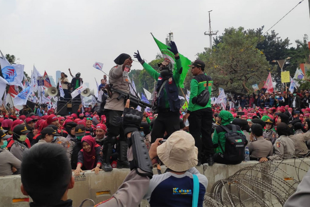 Jakarta: Ribuan massa buruh dari berbagai elemen memadati Jalan Gatot Subroto mulai dari Semanggi hingga di depan Restoran Pulau Dua, atau sekitar 200 meter dari gerbang utama Gedung MPR/DPR/DPD RI, Rabu, 2 Oktober 2019 siang. Medcom.id/Anggi Tondi Martaon Cek Berita dan Artikel yang lain di Google News