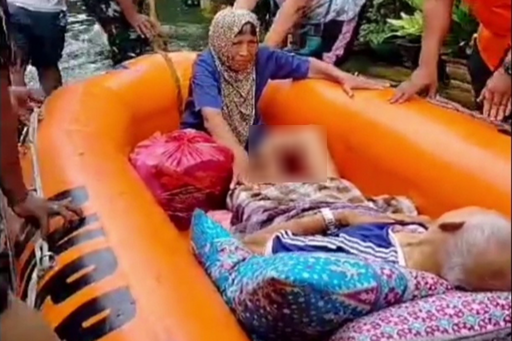 Ada juga seorang lansia laki-laki dievakuasi petugas BPBD Jatim bersama anggota TNI dibantu warga. Evakuasi menggunakan perahu karet, membawa lansia itu ke tempat aman yang kering.