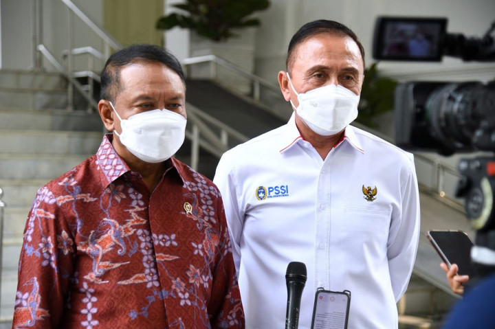 Presiden Jokowi saat menerima Menteri Pemuda dan Olahraga (Menpora) Zainudin Amali bersama Ketua Umum Persatuan Sepak Bola Seluruh Indonesia (PSSI) Mochamad Iriawan di Istana Merdeka, Jakarta, Rabu, 3 Agustus 2022.