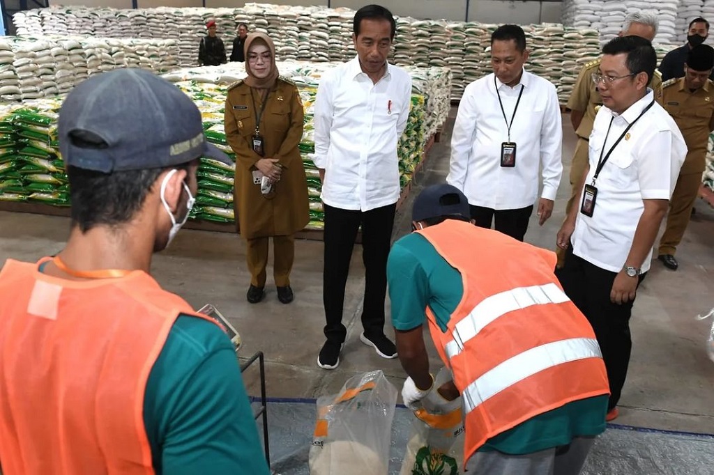 Jakarta: Presiden Joko Widodo (Jokowi) menyalurkan Cadangan Beras Pemerintah (CBP) sebagai bantuan pangan tahun 2023 di BUMN Logistik Gudang Bulog di Kartasura, Sukoharjo Kabupaten, Jawa Tengah, Senin, 10 April 2023