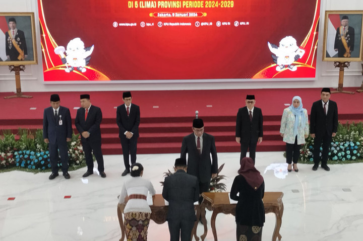 Jakarta: Komisi Pemilihan Umum (KPU) melantik 100 anggota KPU dari 20 kabupaten/kota di lima provinsi se-Indonesia periode 2024-2029.