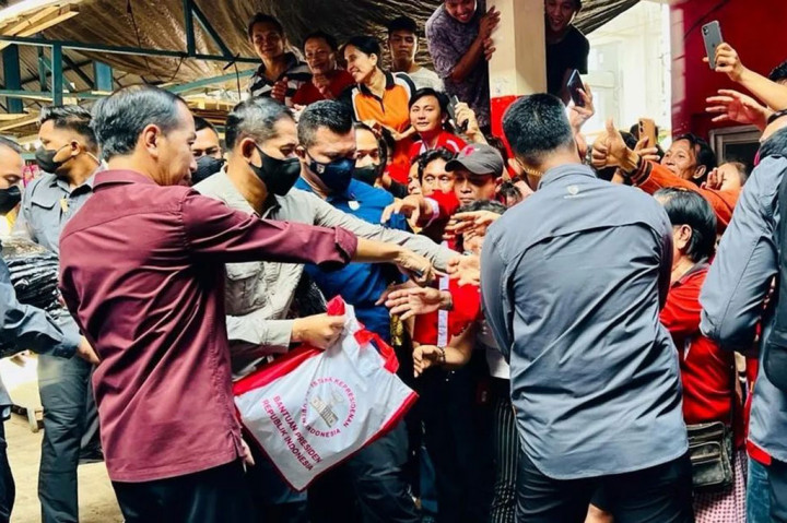 Jakarta: Presiden Joko Widodo (Jokowi) membagikan bantuan sosial kepada masyarakat di Pasar Rakyat Pinasungkulan, Karombasan, Kota Manado, dan Pasar Airmadidi, Kabupaten Minahasa Utara, Sulawesi Utara, Kamis, 19 Januari 2023.