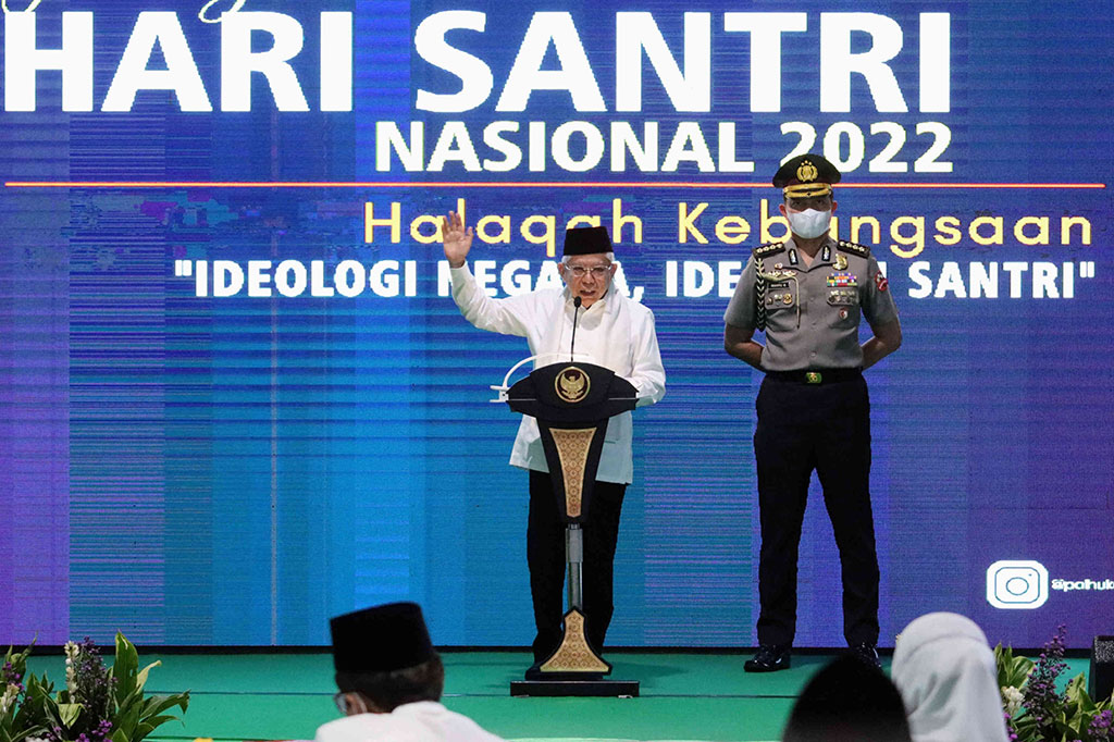 Wakil Presiden Ma'ruf Amin mengatakan santri terus berperan mengisi kemerdekaan dan pembangunan bangsa Indonesia sejak resolusi jihad pada 22 Oktober 1945. Hal itu dikatakan Wapres pada Peringatan Hari Santri Nasional di Kantor Kemenkopolhukam Jakarta, Jumat, 21 Oktober 2022.