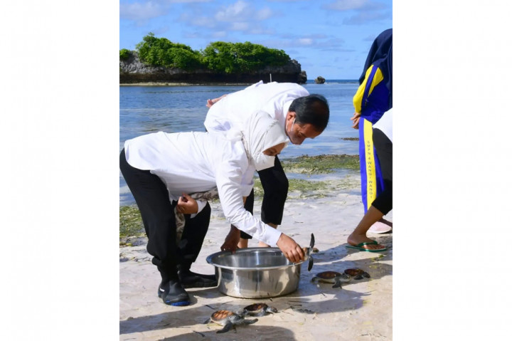Jakarta: Presiden Joko Widodo dan Iriana Jokowi melepas tukik penyu bersama masyarakat, di Patuno Resort, Kabupaten Wakatobi, Sulawesi Tenggara, Kamis, 9 Juni 2022, sore.