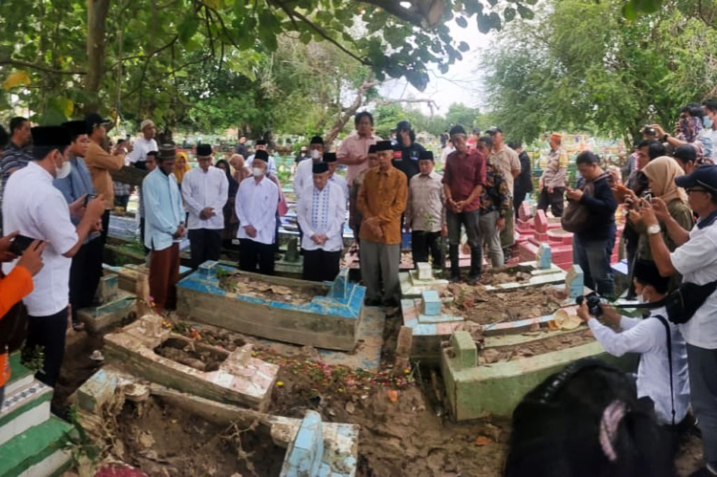 Jakarta: Pimpinan Pondok Modern Darussalam Gontor, KH Akrim Mariyat beserta rombongan bertakziah ke makam AM, 16, santri yang meninggal diduga karena dianiaya, di TPU Sei Selayur, Kecamatan Kalidoni, Palembang, Sumatera Selatan, Jumat, 9 September 2022.