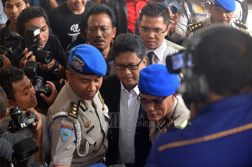 Plt Sekjen PDIP Hasto Kristiyanto (kanan) didampingi penasihat hukum hadir memenuhi panggilan pemeriksaan di Gedung Bareskrim Mabes Polri, Trunojoyo, Jakarta, Selasa (3/2/2015).