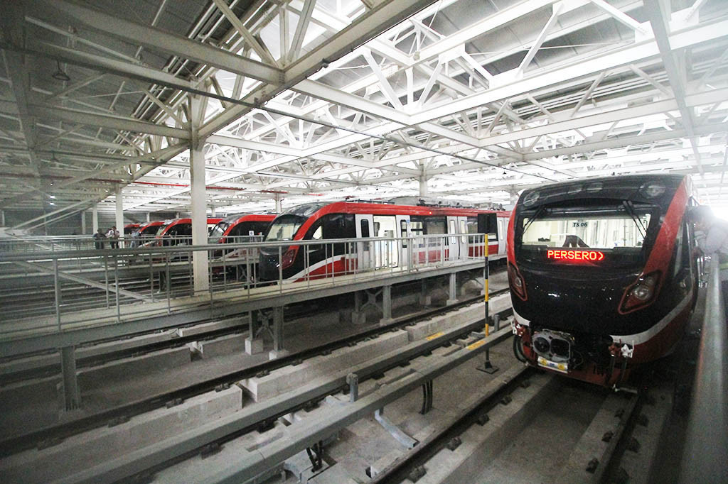 Jakarta: Light Rail Transit (LRT) Jakarta Bogor Depok Bekasi (Jabodebek) lakukan uji coba terbatas dengan perjalanan menuju Kantor Proyek Depo LRT, Kamis, 6 Juli 2023. LRT Jabodebek akan melakukan soft launching pada 12 Juli 2023 hingga 17 Agustus 2023 dengan tarif Rp. 1 bagi setiap penumpang.
