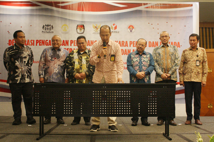 Jakarta: Komisi Yudisial (KY), Komisi Pemilihan Umum (KPU), Badan Pengawas Pemilihan Umum (Bawaslu), Fakultas Hukum Universitas Indonesia (FH UI), Perkumpulan untuk Pemilu dan Demokrasi (Perludem), hingga Kementerian Pemuda dan Olahraga (Kemenpora) menandatangani deklarasi pengawasan persidangan perkara pemilu dan pilkada.