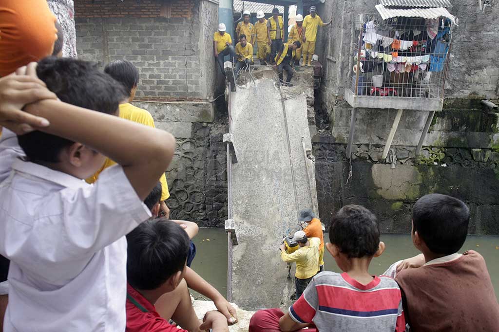 Metrotvnews.com, Jakarta: Pekerja melakukan proses perbaikan bagian jembatan penyeberangan yang roboh di kawasan Manggarai, Jakarata Selatan, Selasa (9/8). Jembatan penghubung untuk warga RW 008 dan 009 Manggarai Selatan tersebut ambruk akibat hujan deras yang mengguyur kota Jakarta pada Senin (8/8/2016) sore. Beruntung tidak ada korban dalam kejadian tersebut. MI/Bary Fathahilah ANTARA/Reno Esnir Cek Berita dan Artikel yang lain di Google News