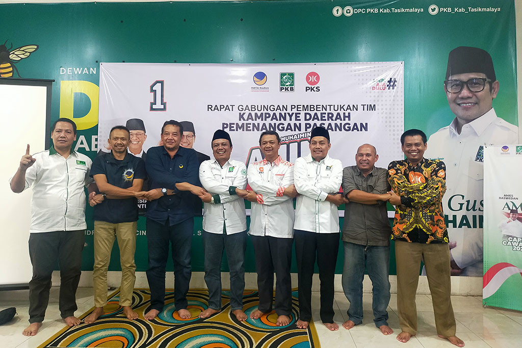 Tasikmalaya: Jelang pemilihan umum (Pemilu) 2024, Tim Kampanye Daerah (TKD) pemenangan Anies Baswedan-Muhaimin Iskandar (AMIN) telah terbentuk yang dihadiri oleh Koalisi perubahan yakni NasDem, PKB dan PKS. Pembentukan tim pemenangan tersebut, dilakukan di kantor Dewan Pimpinan Cabang (DPC) PKB termasuk menjadi posko pemenangan AMIN.