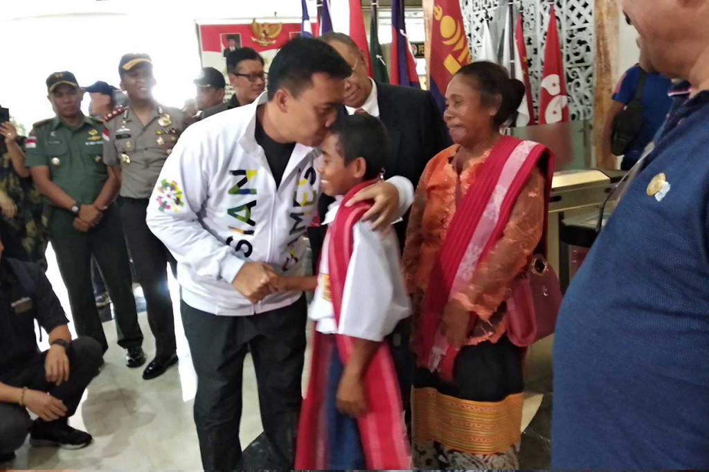Jakarta: Yohanis Gama Marschal Lau, siswa pemanjat tiang bendera saat Upacara HUT ke-73 RI diterima Menpora Imam Nahrawi di Jakarta, Sabtu, 18 Agustus 2018. Oleh Menpora, Joni, sapaan Yohanis diajak menonton langsung pembukaan Asian Games 2018 di Stadion Utama Gelora Bung Karno, malam nanti. Medcom.id/Rendy Renuki Cek Berita dan Artikel yang lain di Google News