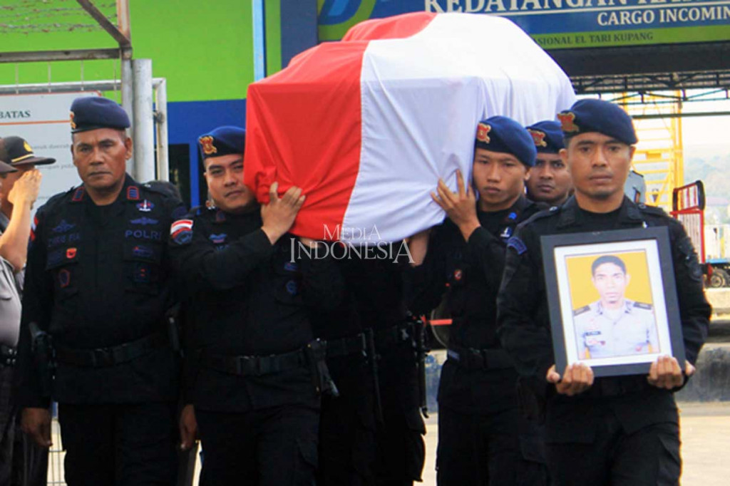 Kupang: Jenazah anggota Brimob Bripka Marhum Prenje, 41, tiba di Bandara El Tari Kupang, Kota Kupang, Sabtu, 12 Mei 2018 pagi. Anggota Intelmob Korps Brimob tersebut menjadi korban penusukan di depan Mako Brimob Depok pada Kamis, 10 Mei 2018 malam. MI/Palce Amalo Cek Berita dan Artikel yang lain di Google News