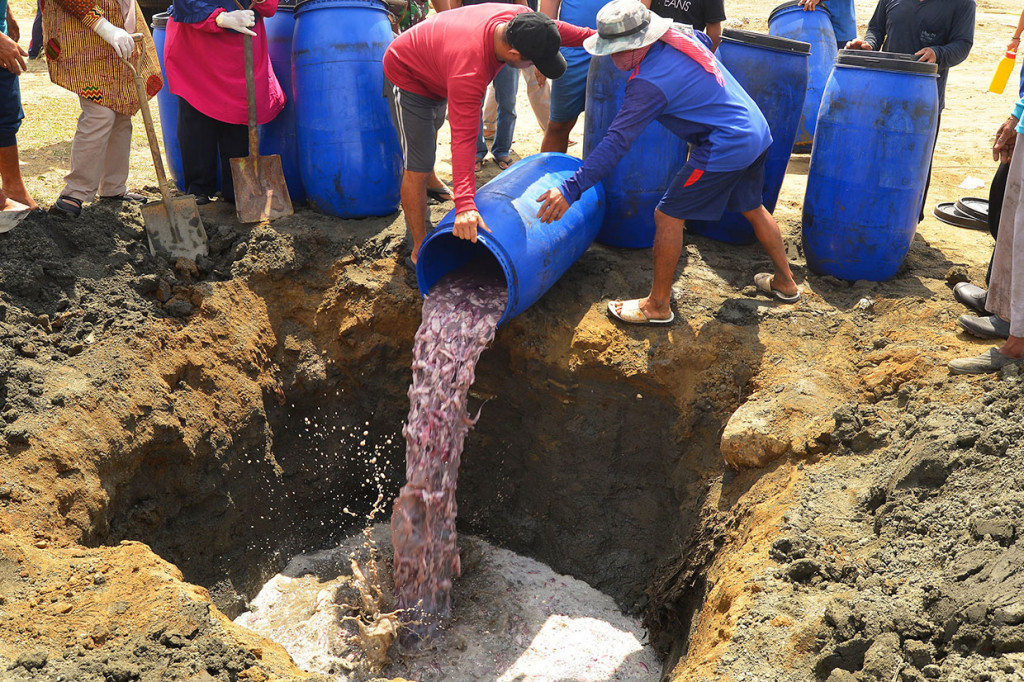 Banda Aceh: Petugas Pengawasan Sumber Daya Kelautan dan Perikanan (PSDKP) Aceh bersama Kejaksaan, Dinas Kelautan dan Perikanan (DKP) dan TNI AL memusnahkan ratusan kilogram ikan campuran dari kapal nelayan berbendera Malaysia dengan ABK warga Thailand yang ditangkap di Selat Malaka beberapa waktu lalu. Antara Foto/Ampelsa Cek Berita dan Artikel yang lain di Google News
