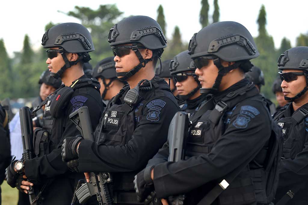 Apel gelar pasukan pengamanan dikuti ratusan personel gabungan dari Polda Bali, TNI AD, AL, dan AU serta beberapa petugas pengamanan presiden atau Paspampres. AFP/Sonny Tumbelaka