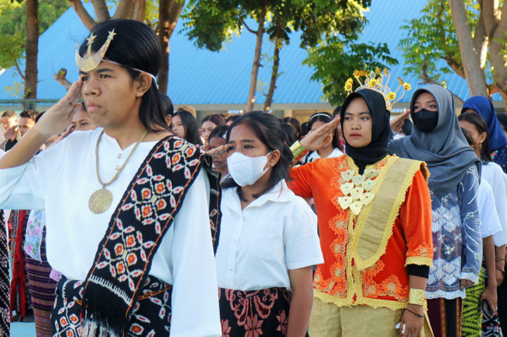Kupang: Seluruh siswa dan guru mulai dari taman kanak-kanak hingga SMA di Kota Kupang, Nusa Tenggara Timu (NTT) mengenakan pakaian adat saat mengikuti upacara Hari Pendidikan Nasional (Hardiknas), Kamis, 2 Mei 2024 pagi. Upacara digelar di masing-masing halaman sekolah berlangsung serentak pada pukul 07.00 Wita.