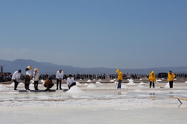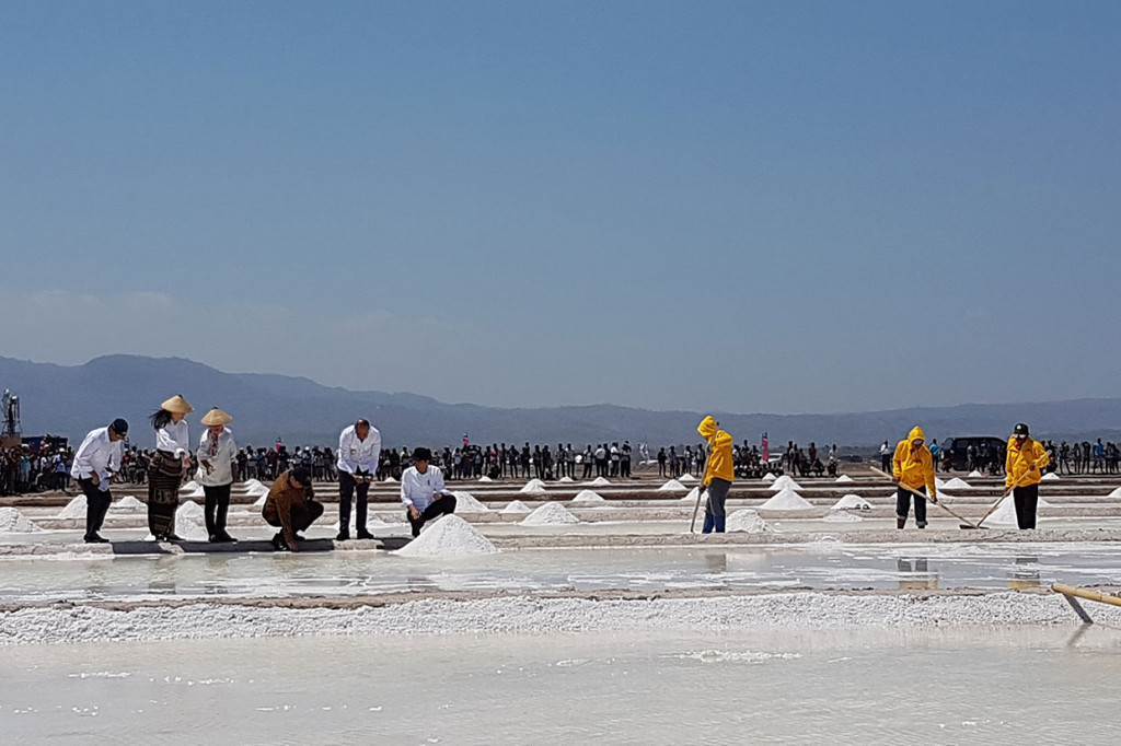 Kupang: Presiden Joko Widodo meninjau operasional tambak garam di Desa Nunkurus, Kupang Timur, Kupang, Nusa Tenggara Timur, Rabu, 21 Agustus 2019. Jokowi ingin memastikan produksi tambak garam di daerah tersebut telah berjalan. Medcom.id/Damar Iradat Cek Berita dan Artikel yang lain di Google News