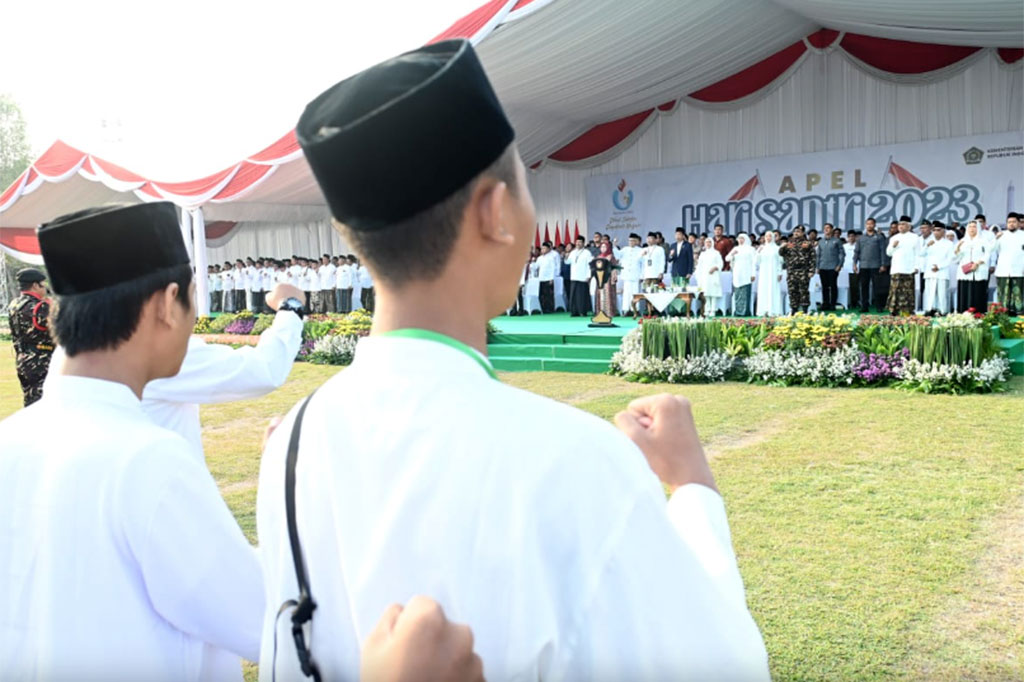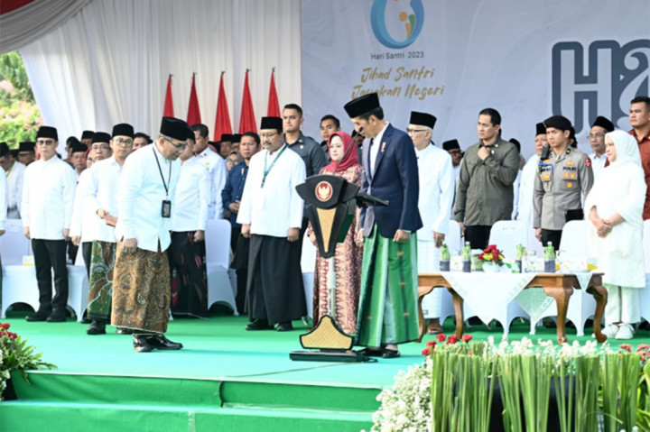 "Semangat hari santri ini harus terus kita pegang teguh sesuai dengan konteks saat ini di mana ada krisis ekonomi akibat perang," kata Jokowi dalam sambutannya saat apel Hari Santri di Surabaya, Jawa Timur, Minggu, 22 Oktober 2023.