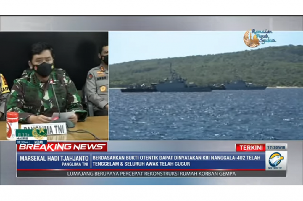 Kapal selam KRI Nanggala 402 terdeteksi terakhir berada di kedalaman 850 meter. Dok. Metro TV Cek Berita dan Artikel yang lain di Google News