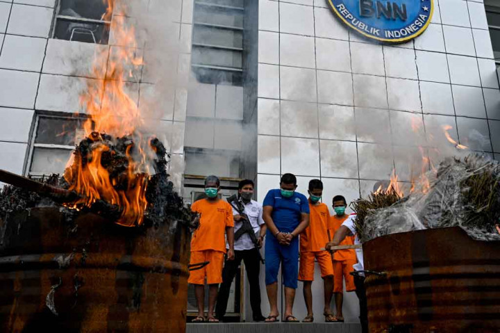 "Dari hasil penyidikan, para tersangka diduga kuat sebagai pengedar ganja dan sabu-sabu. Mereka dijerat Undang-Undang Nomor 35 Tahun 2009 tentang narkotika dengan ancaman hukuman hingga 20 tahun, seumur hidup, dan hukuman mati," tuturnya. AFP PHOTO/Chaideer Mahyuddin Cek Berita dan Artikel yang lain di Google News