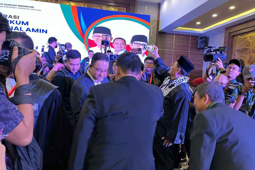Jakarta: Calon presiden nomor urut satu Anies Baswedan dan calon wakil presiden nomor urut satu Muhaimin Iskandar alias Cak Imin (AMIN) menyambangi deklarasi tim hukum nasional hari ini, 27 November 2023. Kegiatan itu dilaksanakan di Swasana Grand Ballroom, Lippo Kuningan, Jakarta Selatan.