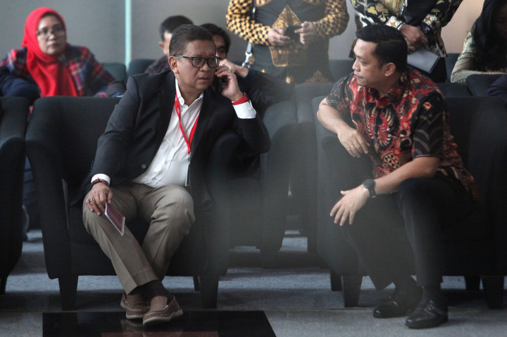 Hasto berpakaian setelah jas hitam dan kemeja putih. Dia datang sambil menyapa awak media