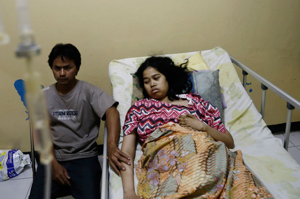 Tati, 26, ditemani suaminya, Karlah terbaring di ruangan perawatan RSUD Indramayu, Jawa Barat, Senin (28/4).