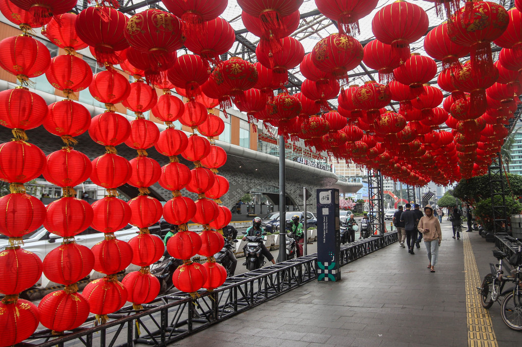 Jakarta: Pedestrian melewati trotoar yang dihiasi lampion dan ornament Imlek jelang Jakarta Light Festival bertema Imlek di Kawasan Bundaran HI, Thamrin, Jakarta, Rabu, 11 Februari 2026.