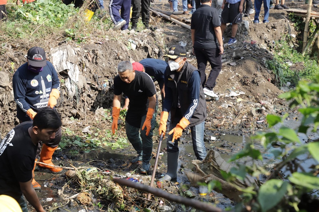 Saat hari masih pagi, Penjabat Wali Kota Malang Wahyu Hidayat bersama warga membersihkan sampah dan sedimentasi di sungai. Mereka gotong royong mewujudkan lingkungan yang bersih dan sehat. Para komunitas