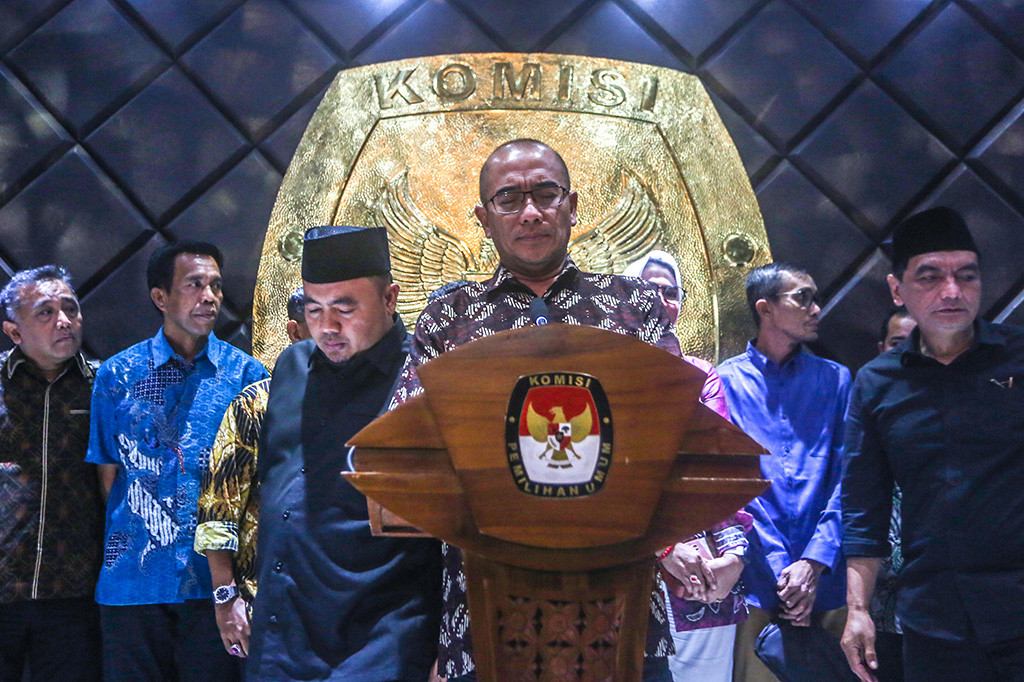 Jakarta: Ketua KPU Hasyim Asy'ari didampingi jajaran komisioner KPU dan para Ketua KPU Provinsi memberikan konpers pamitan kepada wartawan setelah dirinya dipecat dari jabatannya. Hasyim berterima kasih kepada Dewan Kehormatan Penyelenggara Pemilu (DKPP) RI yang telah menjatuhkan sanksi pemberhentian terhadap dirinya.
