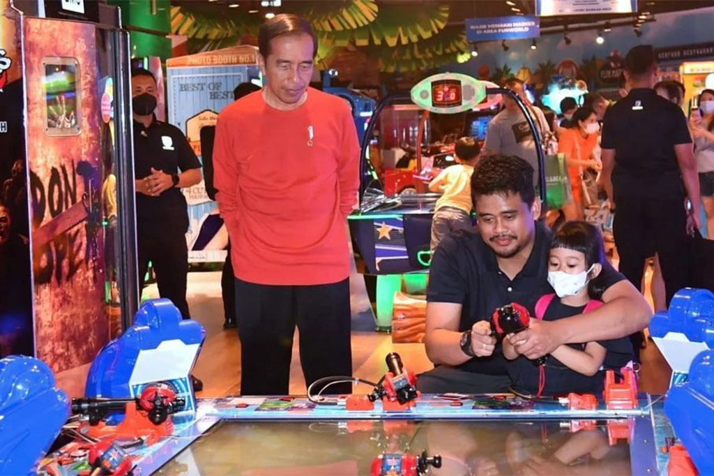 Di pusat perbelanjaan tersebut, Presiden Jokowi yang mengenakan kaos lengan panjang merah mengunjungi salah satu tempat wahana permainan untuk menemani kedua cucunya bermain.