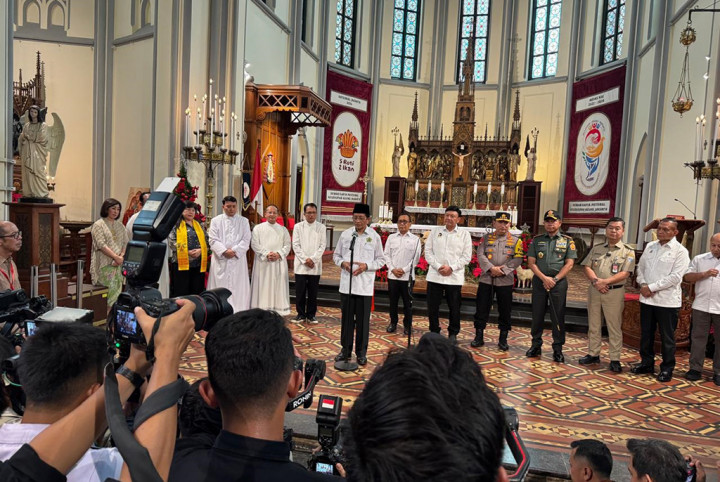 Jakarta: Menteri Koordinator Bidang Politik dan Keamanan Budi Gunawan menyampaikan pesan selamat Hari Raya Natal dari Presiden Prabowo Subianto ketika mengunjungi jemaat yang sedang beribadah Misa Natal di Gereja Katedral, Jakarta, Selasa, 24 Desember 2024.