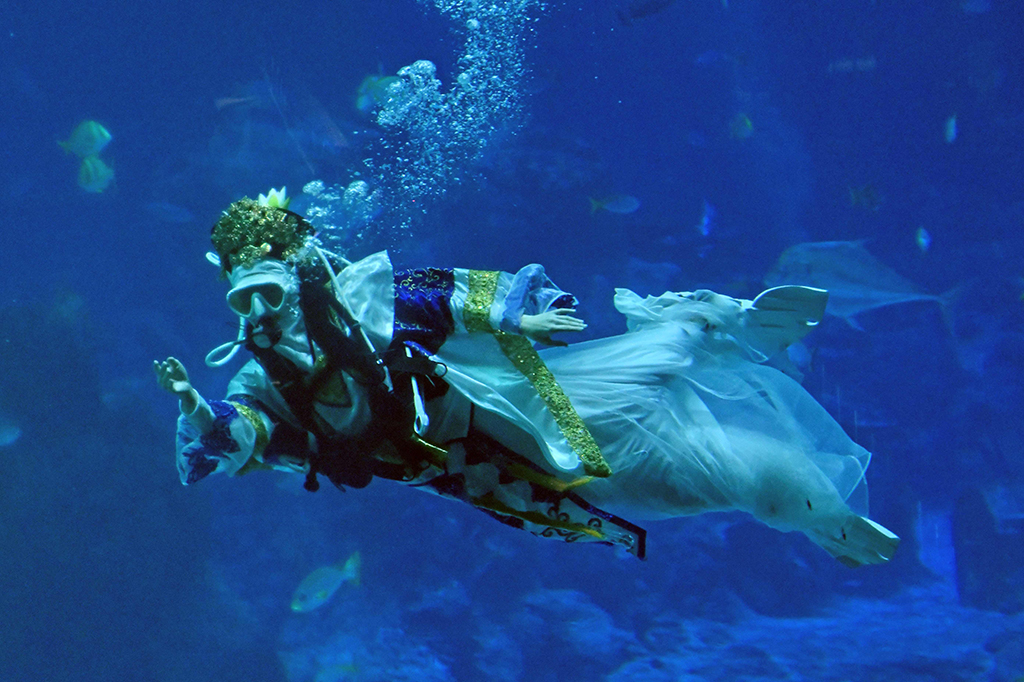 Pengunjung akan dihibur oleh para penyelam yang menggunakan kostum imlek bersama 40 ribu hewan laut, seperti pari manta dan ikan hiu zebra.